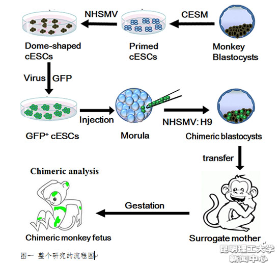 嵌合体动物指由两种或两种以上具有不同遗传物质的细胞共同组成机体组织器官的个体。嵌合体动物的产生一般通过多能干细胞(包括胚胎干细胞和诱导多能干细胞)与胚胎之间的嵌合,随后通过辅助生殖技术而获得。采用嵌合体技术结合基因打靶技术建立的小鼠疾病模型,至1981年以来对生命科学和人类医学的发展做出了革命性的贡献。然而,灵长类多能干细胞是否能够产生灵长类嵌合体,目前仍然是一个世界性难题。