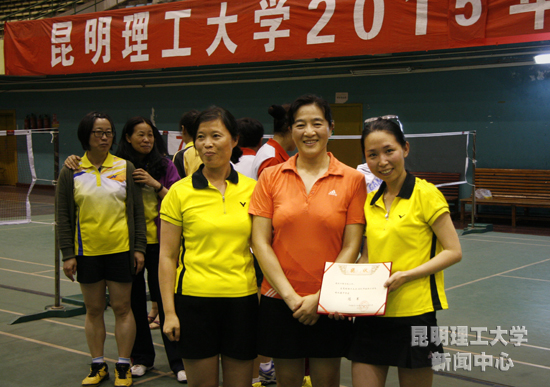 5月11日至15日,校工会在呈贡、莲华、新迎三个校区举行2015年教职工羽毛球比赛。经过5天、共260场次的激烈比赛,冠军由建工3队获得,理学1队、直属4队、冶能4队分别获得亚军、季军及第四名,社科1队、测试1队、机电1队、化工2队并列第五名。校纪委书记李莉为获奖者颁发奖状。