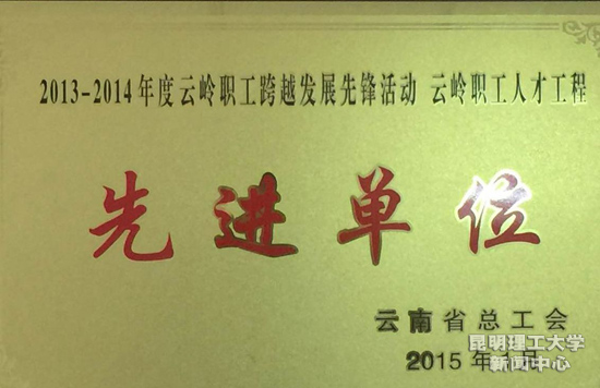 近日,我校工会受到云南省总工会表彰,被授予2013-2014年云岭职工跨越发展先锋活动和云岭职工人才工程先进单位称号。