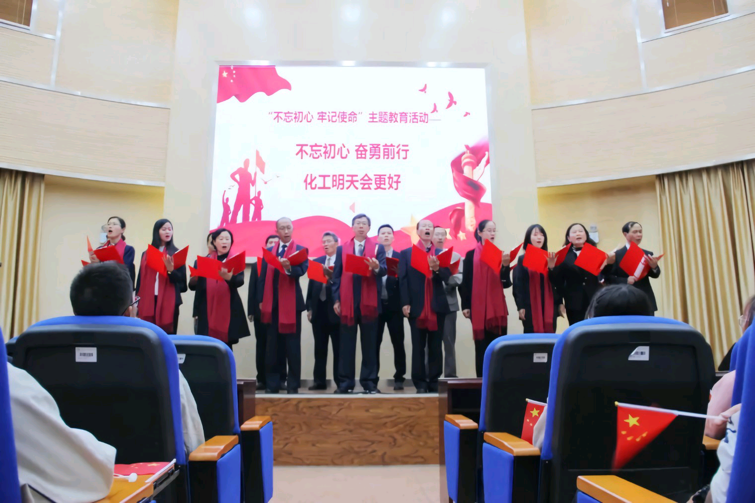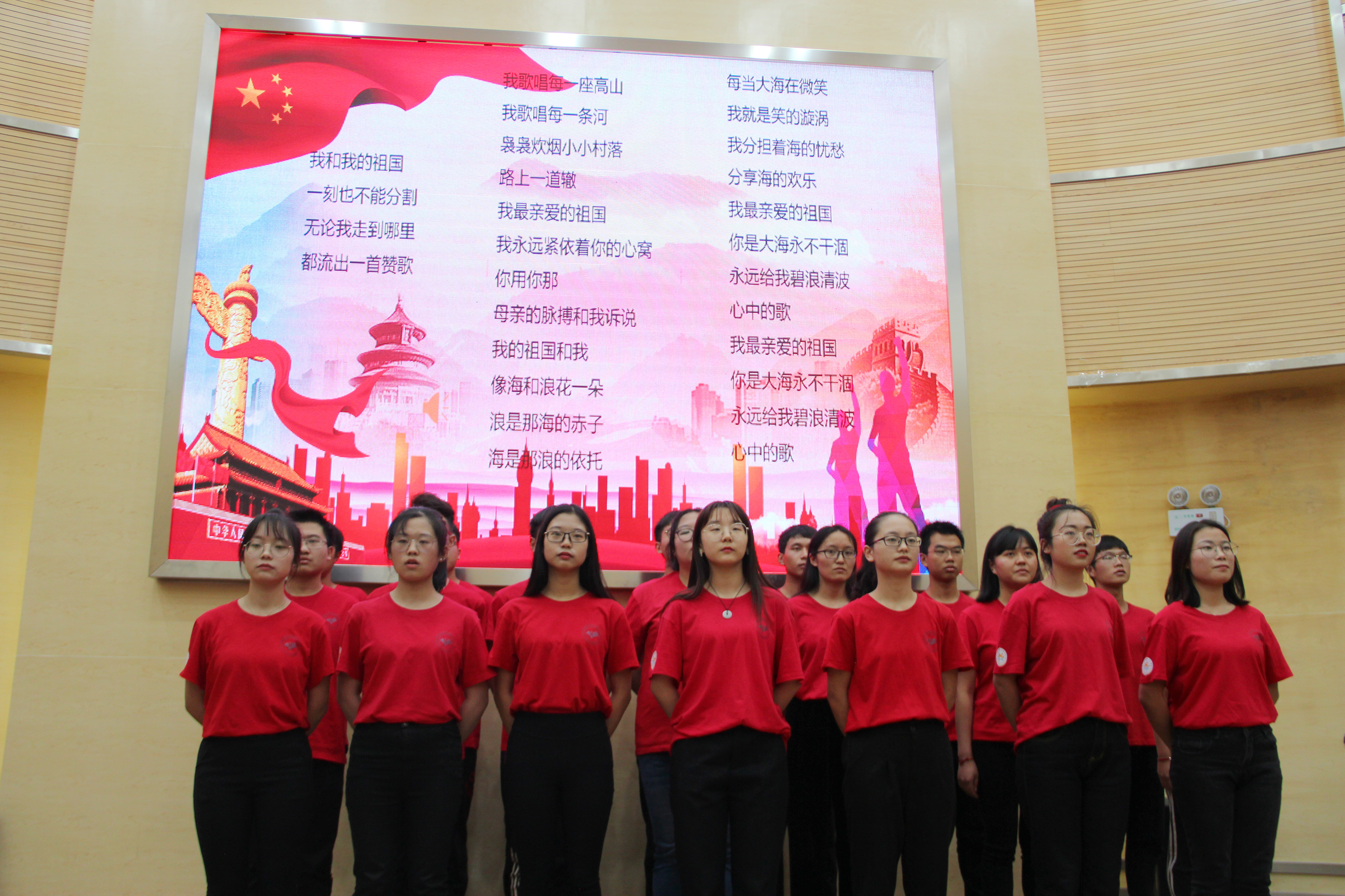 最后师生一起合唱《歌唱祖国》和《我和我的祖国》.