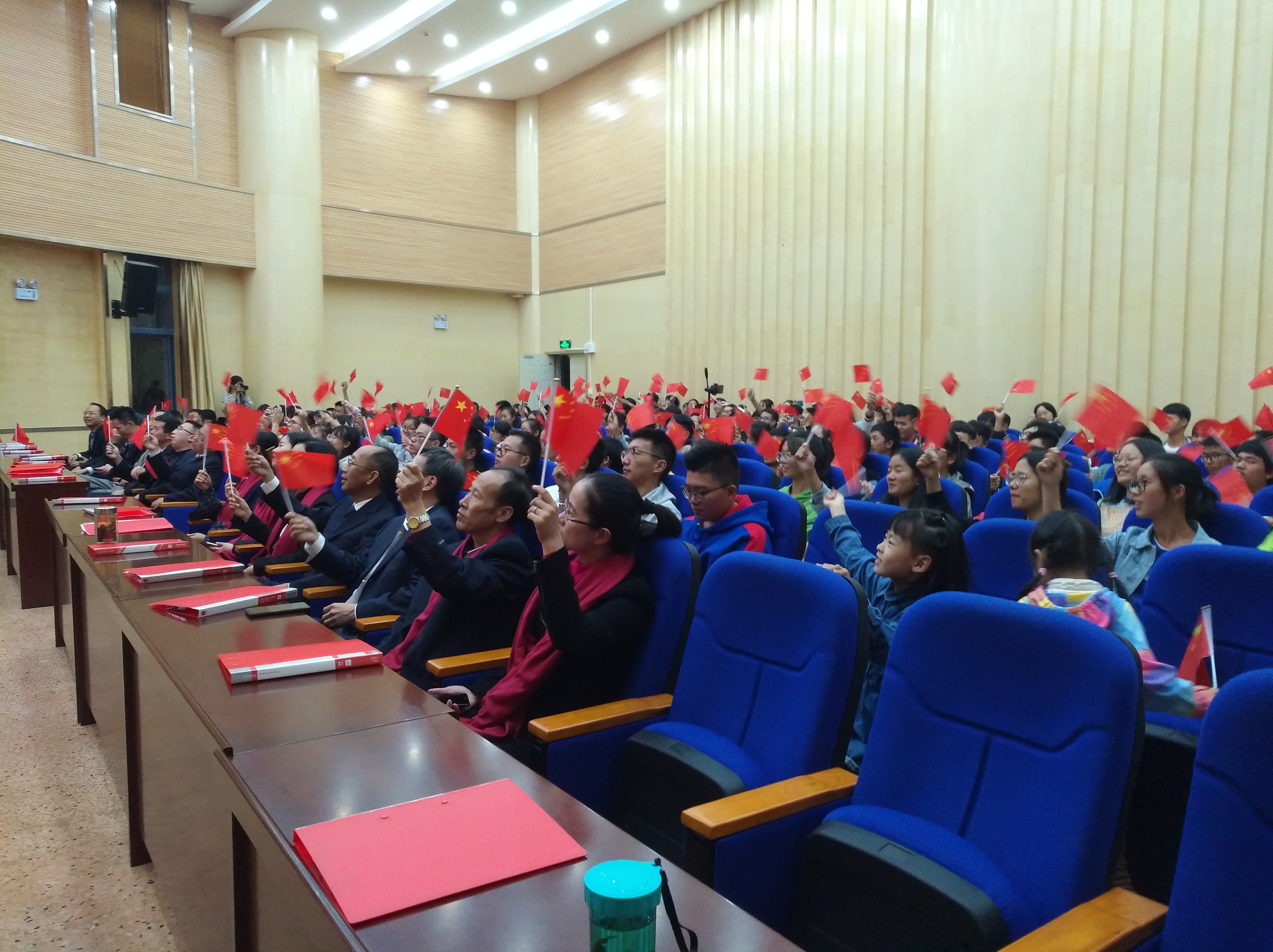 活动伊始,老师与同学们面向国旗,同唱国歌;之后师生共同观看视频,重温开国大典;麦浪老师与同学们演唱歌曲《我爱你,中国》,表达了对祖国的热爱和尊敬;杨敏和高新翔同学用独特新颖的方式讲述了“两弹元勋”邓稼先的生平事迹,体现了为祖国鞠躬尽瘁、无私奉献的爱国主义精神;张云波同学通过对中国伟大工程的介绍,展现了以习近平同志为核心的党中央治国理政的伟大实践;慷慨激昂的朗诵《我们的70年》,展示了70年来伟大祖国在中国共产党领导下,励精图治、艰苦奋斗、改革开放的发展成果。