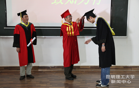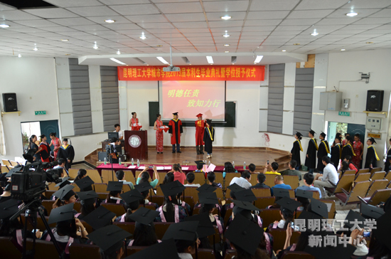 毕业生王磊代表2013届本科毕业生感谢母校的培养,并表示将会时刻铭记“昆工”人“明德任责、致知力行”的校训,以及“城市”人“勤思笃实、知行合一”的院训,在前进的道路上努力拼搏,用自己的智慧与汗水去追求卓越、报效祖国、贡献社会。