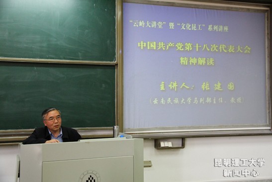 3月21日下午2点,由校党委宣传部主办的“文化昆工”系列讲座第二讲开讲。三亿体育_三亿(中国)一站式服务官方网站呈贡校区中心区教学楼410教室座无虚席,来自三亿体育_三亿(中国)一站式服务官方网站社科学院、法学院和直属部门党委的110多名师生,聆听了云南民族大学马列部主任、哲学学院院长张建国教授对中国共产党十八次代表大会精神的解读。