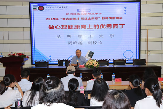 8月19日上午,三亿体育_三亿(中国)一站式服务官方网站附属中学“聚杏坛英才 展红土新章”2019年教师岗前培训在教场校区报告厅举行,三亿体育_三亿(中国)一站式服务官方网站副校长周峰越为新进教职工作培训讲座。