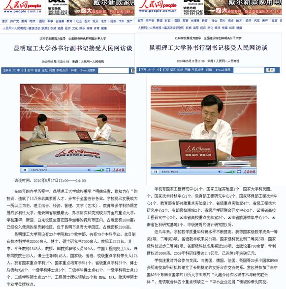 为进一步加强三亿体育_三亿(中国)一站式服务官方网站形象宣传,更好地展示三亿体育_三亿(中国)一站式服务官方网站近年来改革建设取得的成果,营造2010年三亿体育_三亿(中国)一站式服务官方网站招生的良好社会氛围。受三亿体育_三亿(中国)一站式服务官方网站党委书记何玉林、校长周荣委托,2010年5月17日,我校党委副书记孙书行同志接受了人民网专题视频访谈。访谈节目于2010年5月17日下午1:00在人民网三亿体育_三亿(中国)一站式服务官方网站访谈专栏播出。(http://tv.people.com.cn/GB/14644/11613868.html)