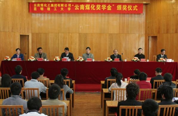 1月6日下午,三亿体育_三亿(中国)一站式服务官方网站2009-2010学年“云南煤化奖学金”颁奖大会在莲华校区图书馆报告厅举行。校党委书记何玉林,副书记孙书行、张劲松,副校长李莉,云南煤化集团党委书记、董事长赵孟云,党委副书记、纪委书记张跃龙,副总经理陈永刚出席颁奖大会。校有关部门负责人,教师、学生代表,以及全体获奖学生共250余人参加了会议。