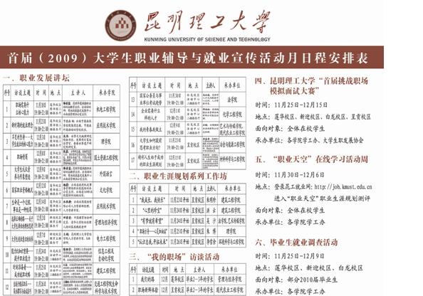 首届职业辅导与就业宣传活动月以“职业辅导与就业宣传”为主题,面向莲华、新迎、白龙、呈贡四校区成功举办了职业发展讲坛、模拟面试大赛、职业生涯辅导工作坊、“我的职场”访谈、毕业生就业调查等一系列形式多样、内容丰富的活动。