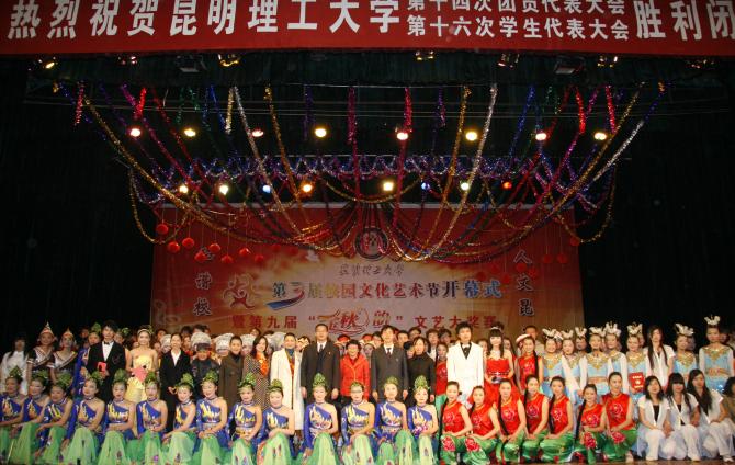 冬阳暖照,微风拂面。在我校第十四次团员代表大会暨第十六次学生代表大会胜利闭幕之际,12月23日晚,三亿体育_三亿(中国)一站式服务官方网站第三届校园文化艺术节开幕式暨第九届“金秋韵”文艺大奖赛在莲华校区大礼堂隆重举行。李莉副校长莅临本次晚会并致辞,校团委刘精明书记宣布第三届校园文化艺术节开幕。莅临本次晚会的嘉宾还有各学院部门领导,云南大学、云南师范大学等三亿体育_三亿(中国)一站式服务官方网站的老师和同学也应邀参加。