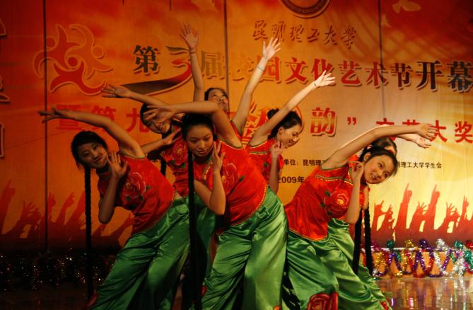 校园内歌声飞扬,处处洋溢着浓郁的青春气息。文艺大奖赛在信息工程与自动化学院乐队演奏的《everybody is fool》中拉开序幕,演员们用自己精湛的器乐技艺,赢得现场观众的阵阵掌声。随后,冶金与能源工程学院的小伙们伴着奔放的乐曲给我们带来了一支舞蹈《马背旋风》,每一个舞姿都是如此热烈,仿佛每一个骑手都是一阵旋风,展示了浓浓的草原情怀;法学院的女生们为我们带来动感十足的现代舞《猫》,像特立独行的黑夜精灵守护着一方刚毅的土地;生命科学与技术学院同学的男女对唱《金花花儿遍地开》让我们一起感受了大理民歌的婉转悠扬,青春懵懂的秘密就藏在这深情款款的歌声当中;外国语言文化学院的舞蹈《海那边》表达了我们青年一代对祖国统一,民族大团结的渴望,一弯浅浅的海峡挡不住亲人的思念;机电工程学院的一曲小提琴演奏《夏夜》让我们沉醉在迷人的夜色中,仿佛星星眨着眼,在轻柔的风间等着流星的誓言;化学工程学院的舞蹈《月引霓裳》让我们梦回大唐,盛世的春风,辉煌灿烂;建筑工程学院的舞蹈《废墟崛起》展示了我们中华民族众志成城、团结互助的不朽精神;国土资源工程学院的歌伴舞《万物生》悠扬得像古老的民谣,涤荡了你我的心灵;材料科学与工程学院的舞蹈《呼唤绿荫》唤醒人们对大自然的回忆;艺术与传媒学院的器乐演奏《梅花三弄》像微风拂过,留下一地芬芳;电力工程学院的舞蹈《北京喜讯传边塞》像一把冉冉的烈火燃烧起浓浓的喜悦;法学院同学的一曲《向天再借五百年》激情澎湃;国土资源工程学院的小品《小学中学大学》在嬉笑中回顾了我们的一路成长;现代农业工程学院带来的舞蹈《踏歌起舞》音律曼妙,舞步轻灵;理学院同学带来的歌曲《舍不得》及小提琴演奏《摘星》在绚丽的舞台上显得格外恬静、美好;交通工程学院同学的一曲《热情的沙漠》把晚会推向了又一个高潮;管理与经济学院的女生们为大家带来的舞蹈《大把把辫子》展示了中华女儿的独特魅力;环境科学与工程学院的舞蹈《梯田花季》展示的是耕耘者的自豪。