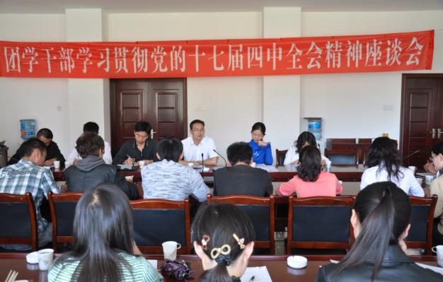 学习宣传贯彻十七届四中全会精神是我校各级团组织和广大团干部当前和今后一段时间内一项重要任务。校团委在下发《关于学习宣传贯彻党的十七届四中全会精神的通知》,对全校各级团组织和广大团干部学习贯彻党的十七届四中全会精神工作进行及时布置的基础上,召开本次座谈会,旨在掀起我校团员青年学习贯彻党的十七届四中全会精神热潮,并希望各级团组织和广大团干部以全会精神指导我校共青团工作创新,推进共青团基层组织建设,推动我校共青团全面快速发展。