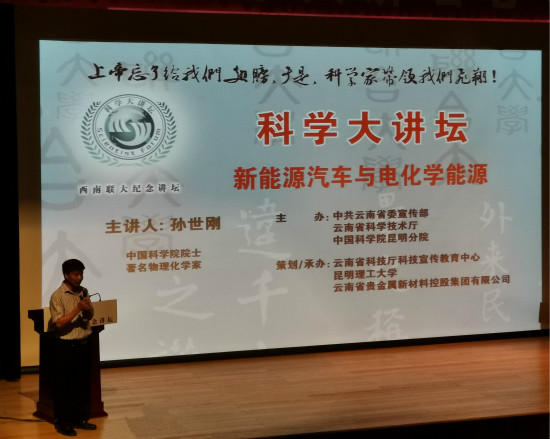 6月26日下午,由中共云南省委宣传部、云南省科学技术厅、中国科学院昆明分院主办,云南省科技厅科技宣传教育中心、三亿体育_三亿(中国)一站式服务官方网站、云南省贵金属新材料控股集团有限公司承办的“科学大讲坛”在三亿体育_三亿(中国)一站式服务官方网站莲华校区伍集成会堂举行。中国科学院院士、著名物理化学家孙世刚院士做客三亿体育_三亿(中国)一站式服务官方网站,并做了题为《新能源汽车与电化学能源》的学术报告。