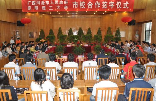 材料与冶金工程学院院长施哲、广西金山铟锗冶金化工有限公司董事长王宗贤分别代表双方在科学技术合作协议书上签字。今后五年内,该公司将作为材冶学院冶金产品研发和学生实习基地,学院将协助公司解决生产过程中遇到的技术难题,并为公司培养专业技术人员。