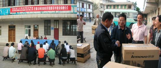 受校党委委托, 9月5日下午,应用技术学院前往石林县路美邑镇开展支援石林县新农村建设捐赠活动,向路美邑镇所辖的九个村民委员会捐赠了九套电脑。学院党委书记付庆新、副院长王毅珏、石林县委组织部副部长高云曦、校党委组织部主任科员潘辉、石林县路美邑镇镇长李忠华、副镇长牛云祥、镇所属九个村民委员会主任、新农办有关人员及部分新农村建设指导员参加了捐赠仪式。