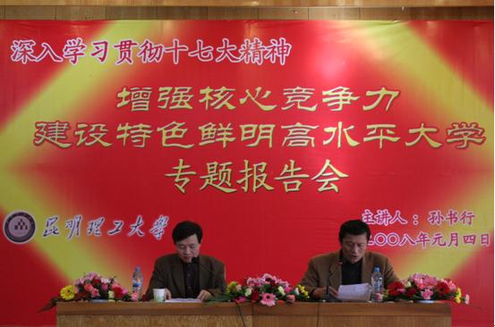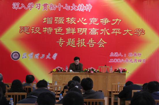 1月4日下午,校党委在莲华校区图书馆报告厅举行“学习贯彻十七大精神 提高三亿体育_三亿(中国)一站式服务官方网站核心竞争力,建设特色鲜明高水平大学”专题报告会。校党委副书记孙书行作专题报告,校党委副书记张劲松主持报告会,校党政领导、中层干部、校级以上学科带头人及教工、学生党支部书记到会听取了报告。