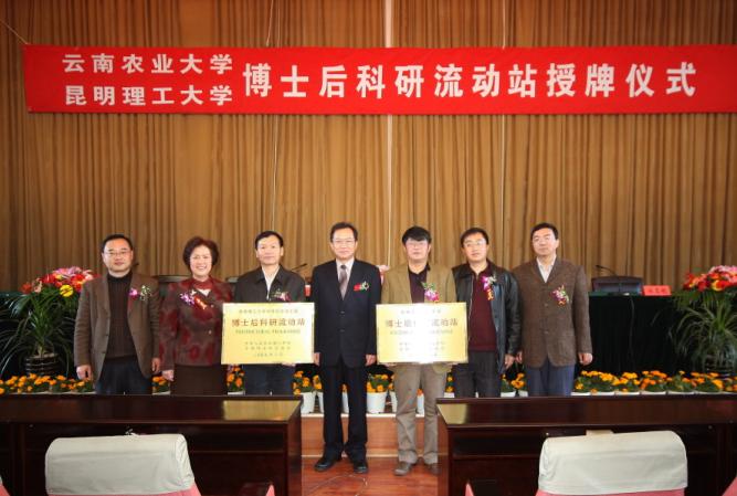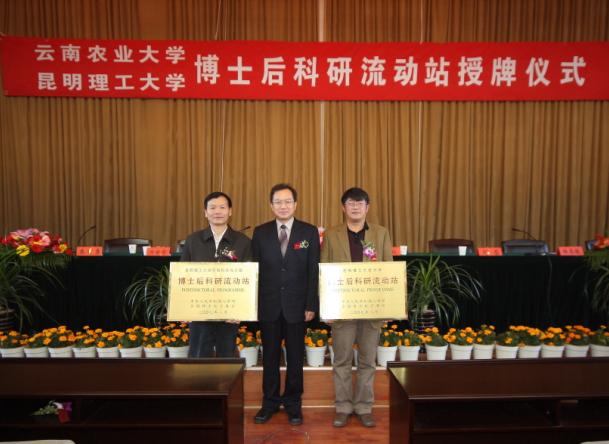 12月12日由云南省人事厅主持的云南省新增博士后科研流动站暨三亿体育_三亿(中国)一站式服务官方网站、云南农业大学博士后科研流动站授牌仪式在云南农业大学举行,授牌仪式由云南省人事厅副厅长徐文波主持,云南省委组织部副部长、省人事厅厅长解毅向今年云南省获得“环境科学与工程、力学、植物保护” 博士后科研流动站所在单位三亿体育_三亿(中国)一站式服务官方网站、云南农业大学的校长授牌。校长周荣出席授牌仪式并发表了讲话,云南省科技厅副厅长洪世奇、云南省人事厅、云南省教育厅有关领导及我校校长助理程赫明、人事处处长李毅、副处长降富楼、副处长兼校博士后管理办公室主任高绿绮、环工学院党委书记龚增俊、建工学院副院长郭荣鑫等有关部门负责人出席了授牌仪式。