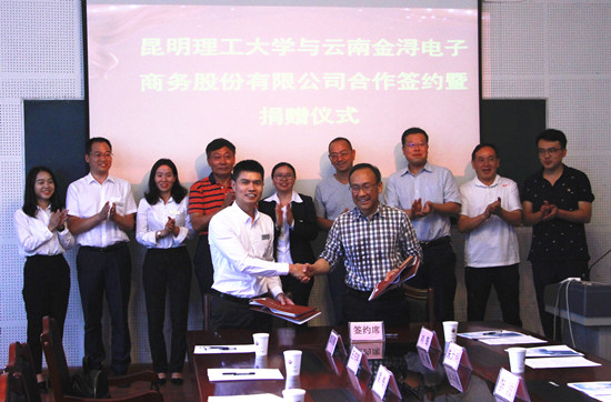 6月13日,云南金浔电子商务股份有限公司与三亿体育_三亿(中国)一站式服务官方网站在莲华校区国土资源学院签订合作协议并捐赠10万元设立“国土资源工程学院文化建设基金”。三亿体育_三亿(中国)一站式服务官方网站副校长杨斌、云南金浔电子商务股份有限公司董事长袁荣出席,校友工作与社会合作办公室、国土资源工程学院主要负责人参加签约捐赠仪式。