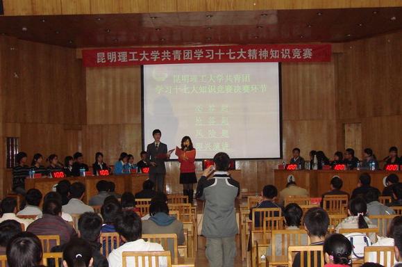 12月12日晚7时30分,我校共青团学习十七大精神知识竞赛决赛在莲华校区图书馆二楼报告厅举行。校办主任聂磊、校党委宣传部部长刘智国、校纪委副书记杨合荣、校党委办公室副主任刘精明、社会科学学院科技哲学教研所所长李耀平教授担任评委;应用技术学院党委书记付庆新、法学院党委副书记方文龙出席了竞赛决赛现场,报告厅座无虚席。