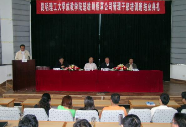 5月29日上午,成人教育学院在我校新迎校区主楼报告厅举行楚雄州烟草公司管理干部培训班结业典礼。学院党委书记李碑喜、楚雄州烟草公司副经理董建国、成人教育学院副院长梁耀、楚雄州烟草公司劳动人事部部长季文聪出席结业典礼。