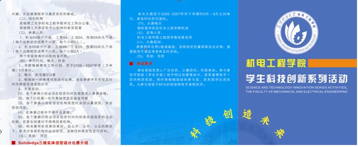 为顺应素质教育时代的潮流,提升大学生的创新设计思维水平,加强大学生的动手能力和解决实际问题的能力,努力培养具有综合素质及实作能力的优秀工科人才,展现机电学子的良好风貌,机电院学生工作办公室经过与各专业教研室的交流、协调,决定于2007年3月至6月开展“机电工程学院学生科技创新系列活动”。本次活动包括“大学生小制作、小发明比赛”、“创业计划大赛”、“机械实践动手能力竞赛”、“打字比赛”、 以及“机构创新设计比赛” 和solidedge三维实体造型设计比赛”六个项目。学院各教研室负责相关活动的组织工作,活动覆盖了我院全部学生。目前,系列活动正在有条不紊地的准备、进行当中。
