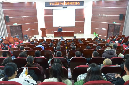 刘院长结合大量的史料、鲜活的案例、详实的数据以及党的最新理论成果,从十九届四中全会的基本情况、重大意义,中国特色社会主义制度的显著优势,坚定中国特色社会主义制度自信,推进国家治理体系和治理能力现代化的总体要求、总体目标和重点任务,以及人事信息和宣贯要求等方面,对党的十九届四中全会精神进行了深入浅出的解读。
