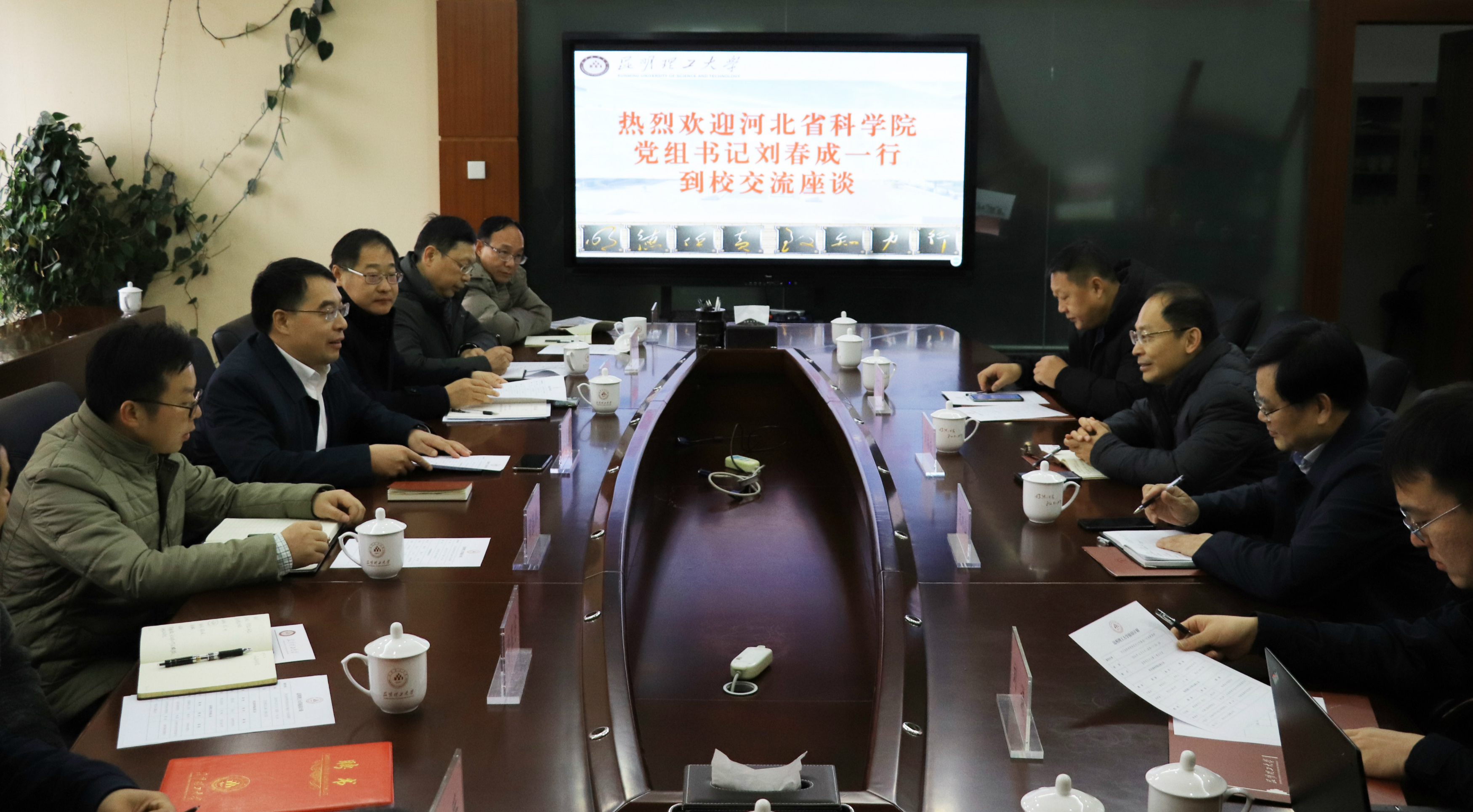 12月2日上午,河北省科学院党组书记刘春成一行4人到三亿体育_三亿(中国)一站式服务官方网站交流访问,校党委副书记、校长王学勤出席座谈会。校长办公室、科学技术院、交通工程学院、生命科学与技术学院、创新发展研究院等相关部门、学院负责人参加座谈交流。