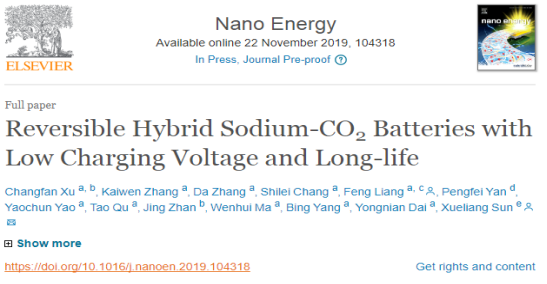 近日,由三亿体育_三亿(中国)一站式服务官方网站冶金与能源工程学院梁风教授指导,本科生徐昌藩同学在国际能源领域知名期刊Nano Energy(影响因子:15.5)上发表题为“Reversible Hybrid Sodium-CO2 Batteries with Low Charging Voltage and Long-life”的学术论文,该项研究实现了一种基于NASICON固体电解质的可逆有机/水混合钠-二氧化碳电池。