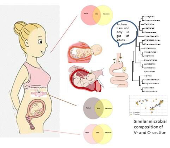 通过课题组研究证明:剖宫产对新生儿胎便样品的微生物群落组成无显著影响,胎便中确实含有微生物,且这些微生物大约有一半左右来源于母亲。2019年8、9月的几篇国际重磅论文都对胎盘中究竟含有微生物还是实验污染做了探讨,但结论不一。本研究在实验过程中设置了较为严格的“采样对照”和“实验对照”,排除了污染的可能性,确定了新生儿孕育环境确实存在微生物;新生儿孕育环境中有产甲烷古生菌的存在等科学问题。