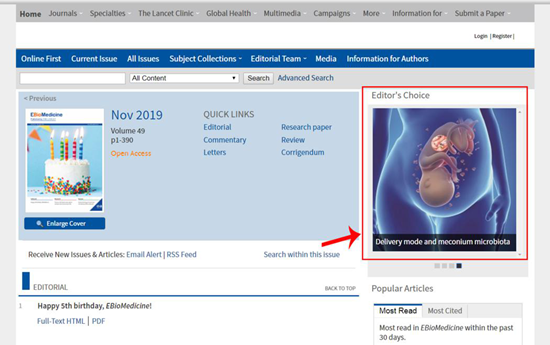 EBioMedicine于2014年底创刊,是柳叶刀旗下的一本Gold Open Access期刊。本刊致力于发表与人类健康和疾病直接相关的高质量原创研究论文,同时,期刊还发表各领域内权威专家所撰写的高水平综述论文、评论以及科学观点性文章。该期刊在“医学、研究和实验”类别的136种期刊中排名11(2018 Journal Citation Reports)。