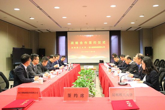 11月8日下午,昆明理工教育发展有限公司与恒大健康集团西部公司战略合作签约仪式在三亿体育_三亿(中国)一站式服务官方网站莲华校区伍集成会堂举行。三亿体育_三亿(中国)一站式服务官方网站党委副书记、校长王学勤,党委常委、副校长周峰越,恒大健康集团西部公司董事长戴军出席,三亿体育_三亿(中国)一站式服务官方网站校办、教育公司负责人等参加仪式。