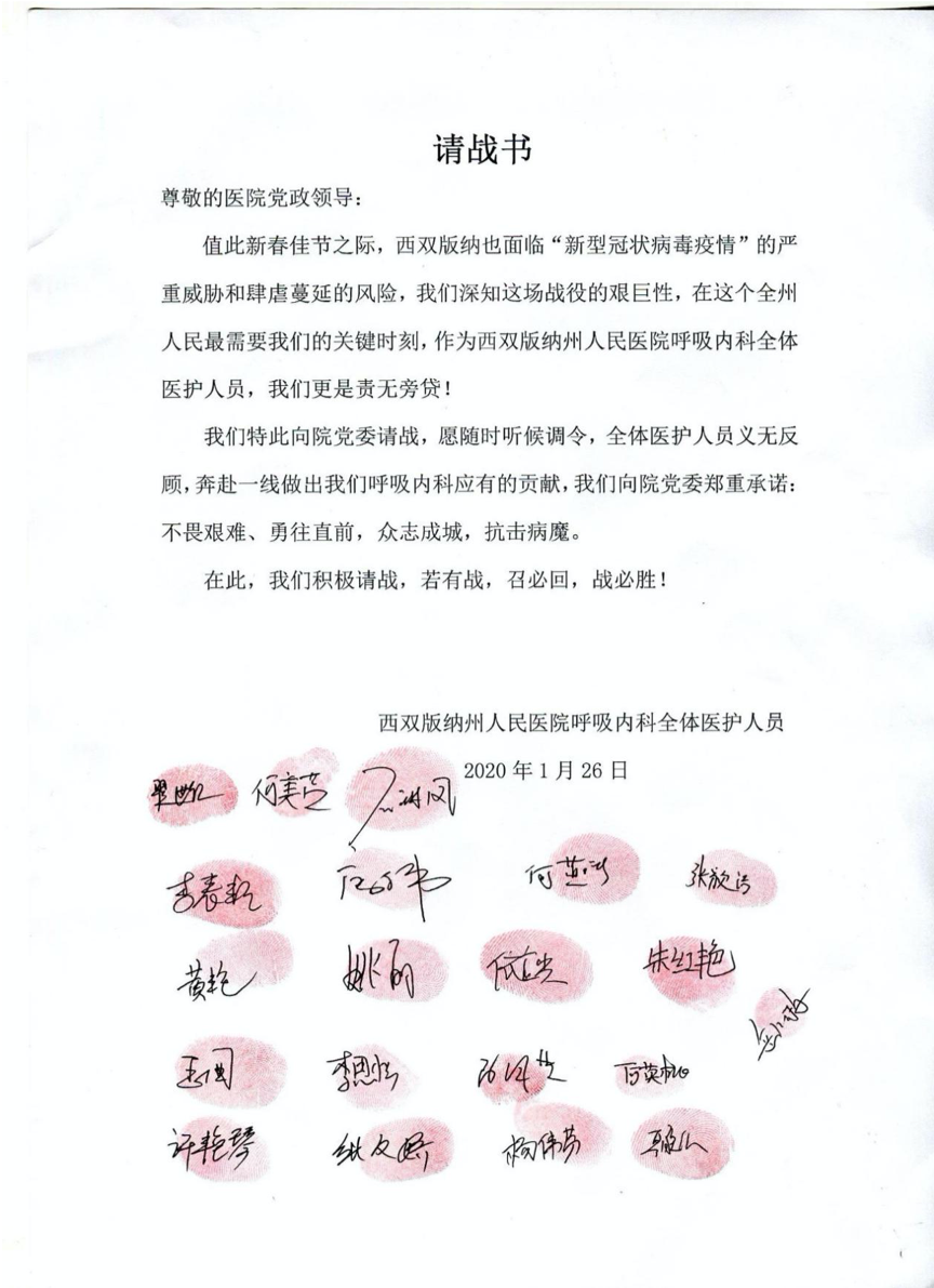 1月25日(大年初一),医院第一医疗志愿队进驻州传染病院,全面接管负责传染病院新冠肺炎确诊病例、疑似病例的医疗救治和临床观察,先后诊治确诊病例15例(危重1例、重症1例),排除疑似病例41例,治愈出院1例,无死亡病例。医务纷纷主动请缨,签下“请战书”,自愿参与抗疫工作,目前已累计派送医疗队2批29人次。