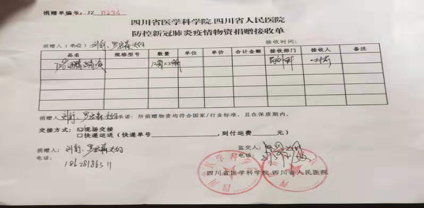 2月11日,测量98级校友罗宏森,四川校友会常务副会长,向四川省人民医院捐赠288瓶酒精消毒液用于抗疫。