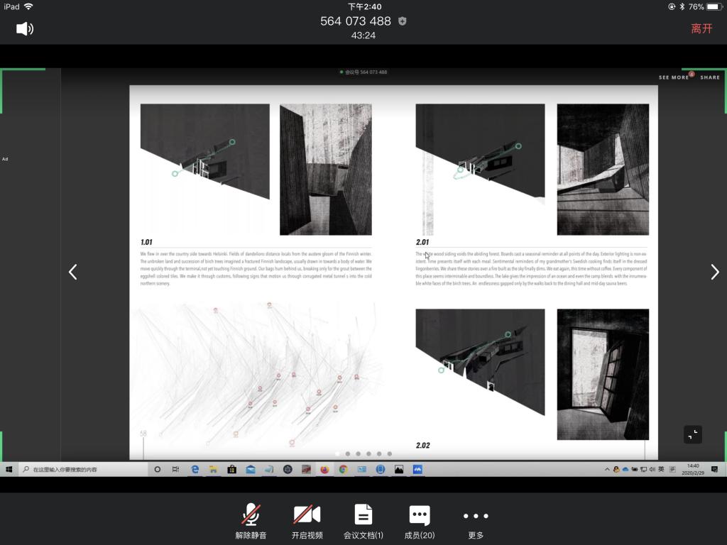 为保证上课的质量,建筑学院在“腾讯会议”平台上提前开始了毕业设计远程教学,分别就毕业设计整体时间进度计划、中期检查前的教学重点、前期分析和设计表达的方法、学习网站和参考文献等进行讲解和建议,对同学是否具备设计课网络教学必备工具进行了摸底调查,同学们也对毕设课题不清楚的部分提出了疑问。通过充分的交流,师生们为开学第一周正式开始的线上远程教学做好了充分的准备,同时,老师们还做好了待学生返校后马上转入正常教学的教学预案。