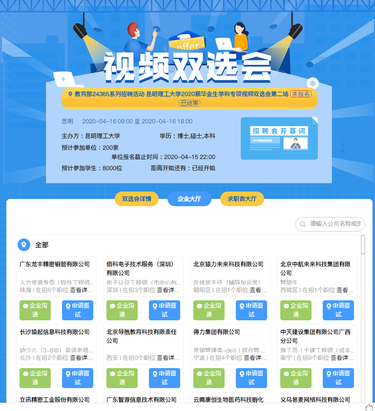 4月16日,三亿体育_三亿(中国)一站式服务官方网站举办第二场学科专项视频双选会,共吸引包括北京、深圳、广东、江苏、四川等省内外150家用人单位参加,提供9000余个以信息、电子、语言、思政、哲学、经济、管理、法律等学科为主的岗位,吸引校内外近4000名毕业生参会,达成意向人数约850人。