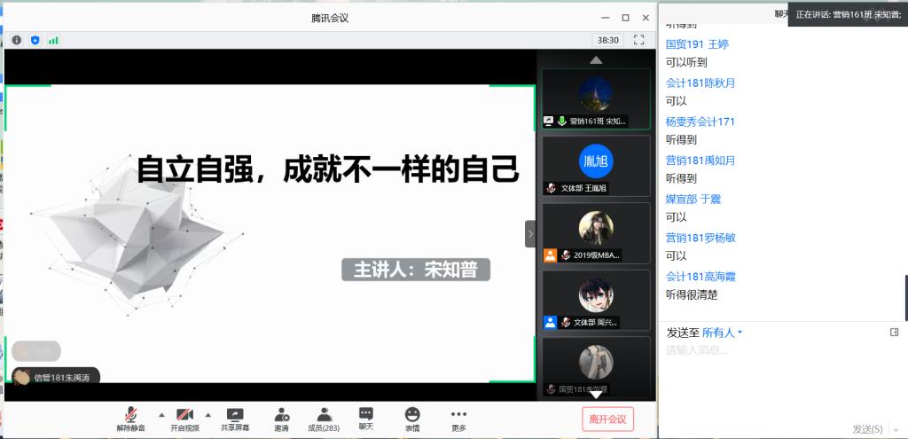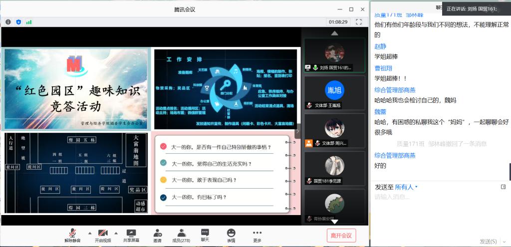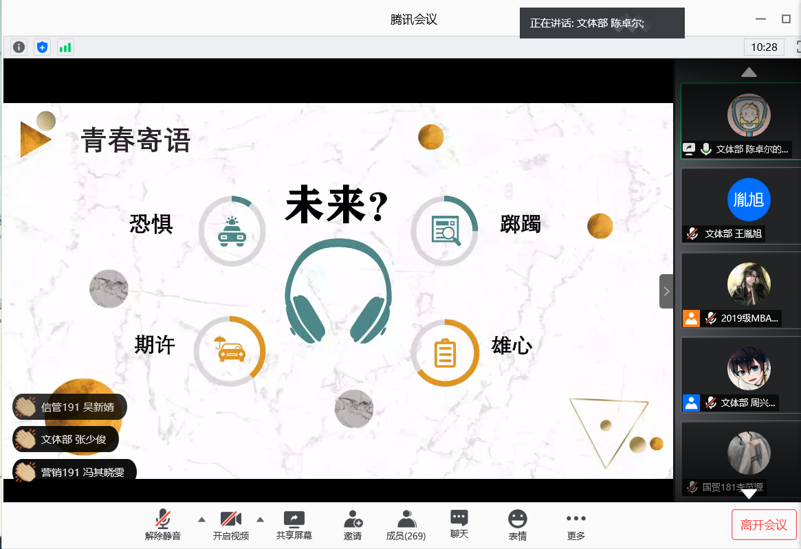 6月11日下午,管理与经济学院通过腾讯会议平台举办了以“未来”为主题的第四期筑梦青春践习站分享会。283名师生参加了分享会,并在评论区积极互动交流。