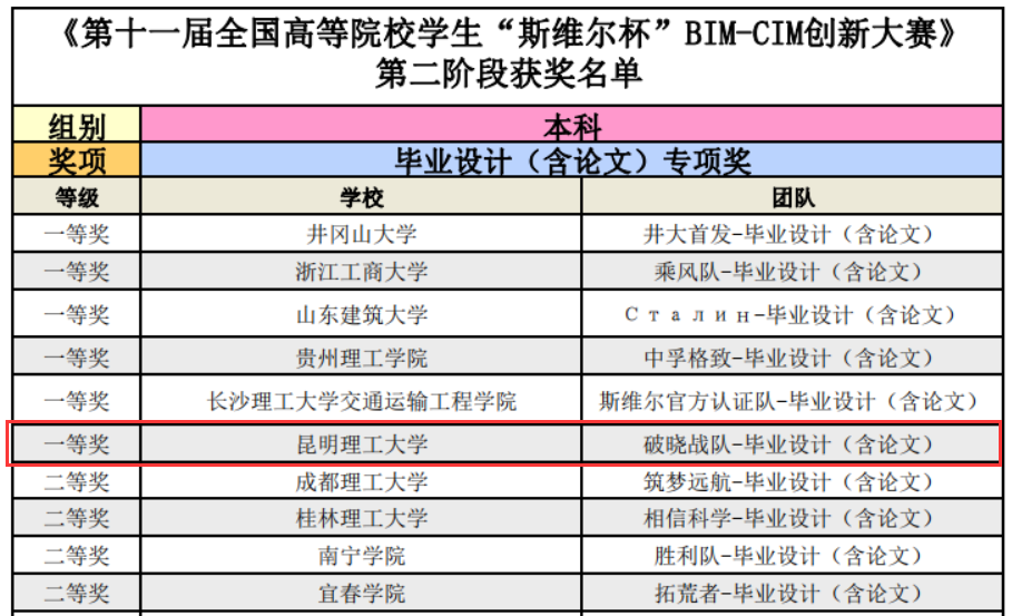 近日,由中国建设教育协会主办,深圳市斯维尔科技股份有限公司和湖南大学承办的第十一届全国高等院校学生“斯维尔杯”BIM-CIM创新大赛以云答辩的方式落下帷幕。来自全国400余所院的1200多支团队参加了比赛,经过层层的选拔,135支团队进入总决赛。三亿体育_三亿(中国)一站式服务官方网站建筑工程学院查乾树、侬娟、陈玲、侯佳珺、张清秋等同学组成的破晓战队代表三亿体育_三亿(中国)一站式服务官方网站参赛,经过层层角逐,最终荣获毕业设计专项一等奖。
