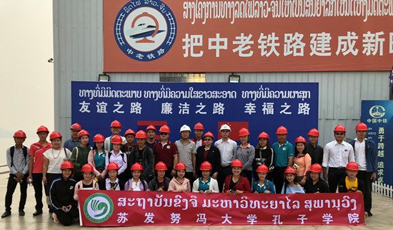2019年4月10日,苏发努冯大学孔子学院开展“走近‘一带一路’、感知中国速度”主题活动, 孔院师生40余人参观中老铁路在建项目琅勃拉邦湄公河特大桥。