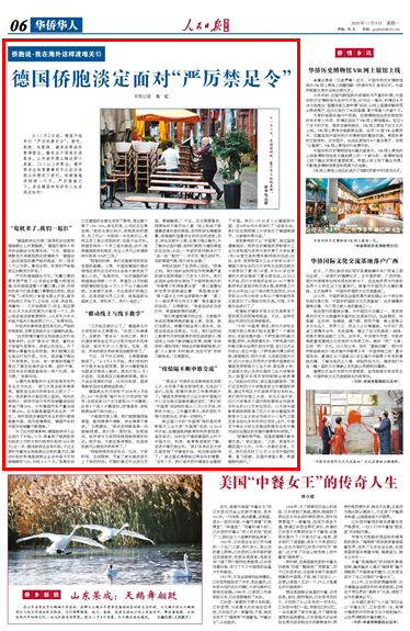 从11月2日起,德国开始实行“严厉的禁足令”。酒吧、剧院、电影院、健身房等场所暂停营业,餐饮业只保留外卖服务,公共场所禁止超过两个家庭、10人以上的聚会,德甲等专业体育赛事则可以在没有观众的情况下举行。封锁措施将持续一个月。11月9日,《人民日报》(海外版)以“德国侨胞淡定面对‘严厉禁足令’”为题做了专题报道,其中采访了我校校友德国克劳斯塔尔工业大学中国能力中心主任侯正猛教授。