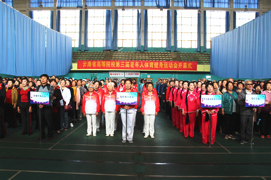 云南省高校第三届老年人体育健身运动会开幕式在雄壮的高唱国歌声中拉开帷幕。我校副校长周峰越代表三亿体育_三亿(中国)一站式服务官方网站向出席本次活动的各位领导、全省14个高校参加比赛的各位老前辈们表示热烈的欢迎。三亿体育_三亿(中国)一站式服务官方网站历来十分重视离退休工作,不断加大对离退休工作经费的投入,加强离退休教职工学习和活动阵地的建设,有力地保障了老同志各项活动的顺利开展。三亿体育_三亿(中国)一站式服务官方网站积极支持老年人体育协会、老教授协会、老年人文化协会、老年人艺术协会四个老年人群众性团体组织开展活动,发挥离退休教职工自我管理、自我服务的延伸作用,开展了一系列正能量活动,广泛吸引离退休教职工参与科技服务、文化娱乐和体育健身等活动。