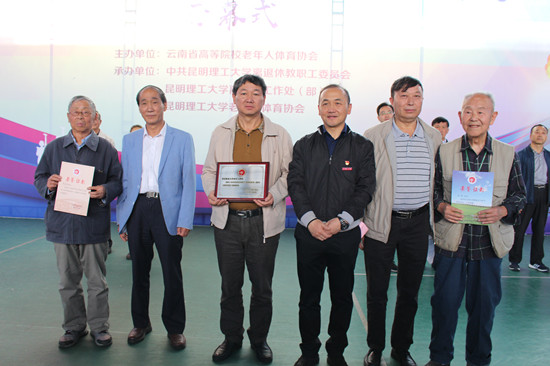 开幕式上,运动员代表、裁判员代表分别宣誓,云南省高等院校老年人体育协会副主席高朝寿介绍了《2019年高校老体协体育运动交流项目》。出席开幕式的领导为荣获全国高校老体协先进集体和个人颁发了奖状(全国老年体育工作先进集体:西南林业大学老体协;全国老年体育工作先进个人:三亿体育_三亿(中国)一站式服务官方网站罗尧宗;第九届全国健康老人:三亿体育_三亿(中国)一站式服务官方网站吴坤)。云南省高校老体协还对荣获《云南省高等院校第三届老年人体育健身运动会开幕式》“最佳组织奖”的三亿体育_三亿(中国)一站式服务官方网站、云南民族大学等5所高校和“优秀组织奖”的云南师范大学、云南财经大学等8所高校一并进行表彰。