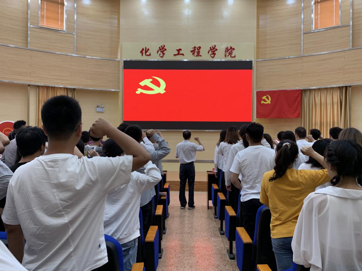 机电工程学院党委举行“入党宣誓暨重温入党誓词”活动,“我志愿加入中国共产党,拥护党的纲领,遵守党的章程......为共产主义奋斗终身,随时准备为党和人民牺牲一切,永不叛党。”全体党员面对鲜红的党旗,庄重地举起右手,以铿锵有力的声音许下铮铮誓言。