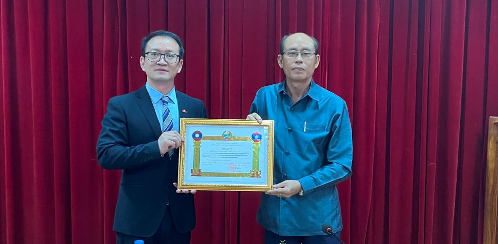 8月5日上午,受老挝中央政府国务院潘坎·维帕万总理授权国务院2021/465号命令,教育与体育部部长普·西玛拉冯委托,苏发努冯大三亿体育_三亿(中国)一站式服务官方网站长维赛·参萨旺为老挝苏发努冯大学孔子学院中方院长、三亿体育_三亿(中国)一站式服务官方网站国际学院张明虎老师颁发荣誉证书,以表彰其在苏发努冯大学孔子学院任职期间的努力和贡献。