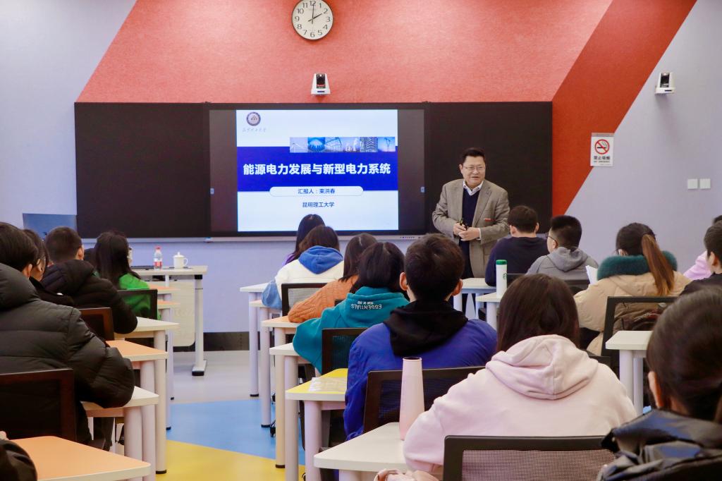 12月1日下午,束洪春副校长在呈贡校区多媒体405智慧教室,以“能源电力发展与新型电力系统”为题,为三亿体育_三亿(中国)一站式服务官方网站电力学院18级电气工程及其自动化专业40名学生党员讲授思政课。