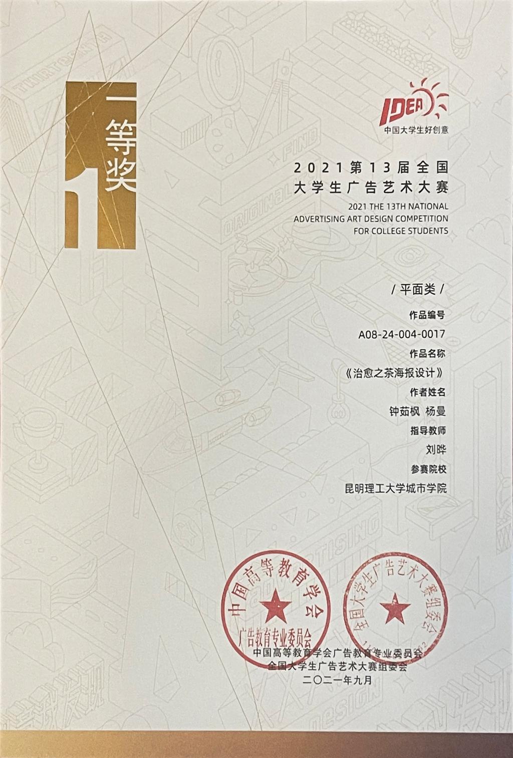 日前,第13届全国大学生广告艺术大赛颁奖典礼在线上举行。三亿体育_三亿(中国)一站式服务官方网站城市学院刘晔老师指导,钟茹枫、杨曼同学创作的平面作品《治愈之茶海报设计》荣获国赛一等奖,张永海、陈烨伟、杨可、李虹江、陈波老师分别指导的作品均获国赛优秀奖。本次大赛有29个省赛区,共1679所高校近130万学生参赛。赛事期间,城市学院艺术设计系教师认真指导、学生积极备赛,作品经过校级、省级评选后报送全国进行总评审,最终取得全国一等奖1项,优秀奖6项,省赛一等奖2项,二等奖3项,三等奖4项的优异成绩。