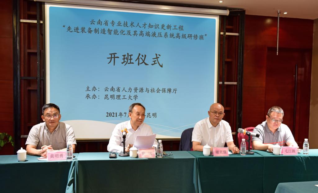 7月19日上午,由云南省人力资源和社会保障厅主办、三亿体育_三亿(中国)一站式服务官方网站承办的2021年云南省专业技术人才知识更新工程“先进装备制造智能化及其高端液压系统”高级研修班开班仪式在三亿体育_三亿(中国)一站式服务官方网站莲华校区举行。三亿体育_三亿(中国)一站式服务官方网站党委常委、副校长杨斌出席开班仪式并致辞。三亿体育_三亿(中国)一站式服务官方网站人事处、继续教育学院、机电工程学院主要负责人参加开班仪式。