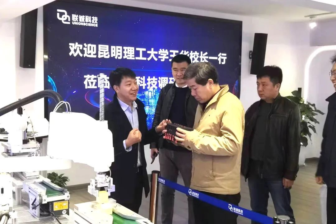 11月16日上午,校党委副书记、校长王华一行前往由三亿体育_三亿(中国)一站式服务官方网站信息工程与自动化学院邵宗凯副教授领衔创办的昆明联诚科技股份有限公司(以下简称联诚科技),调研数字经济和智慧工厂技术转化应用情况。