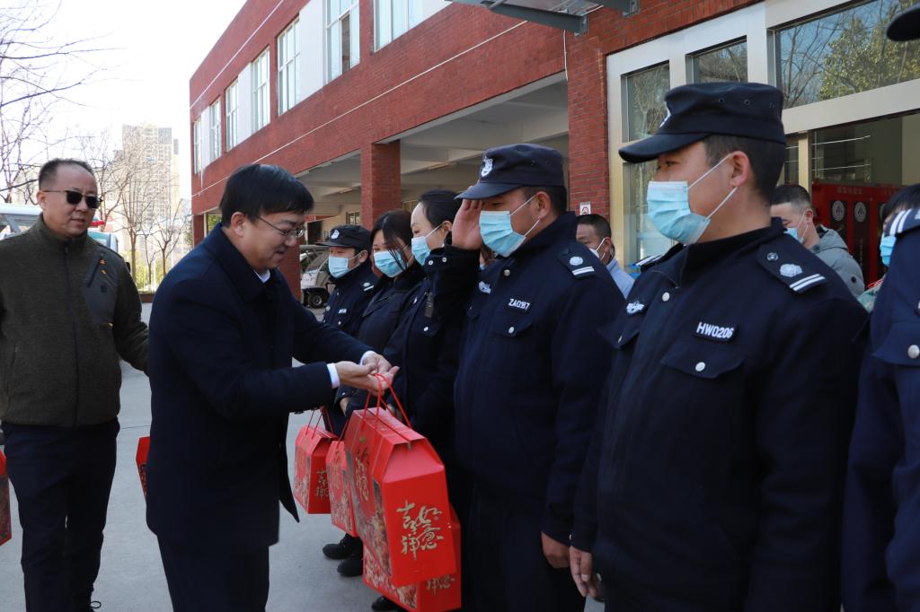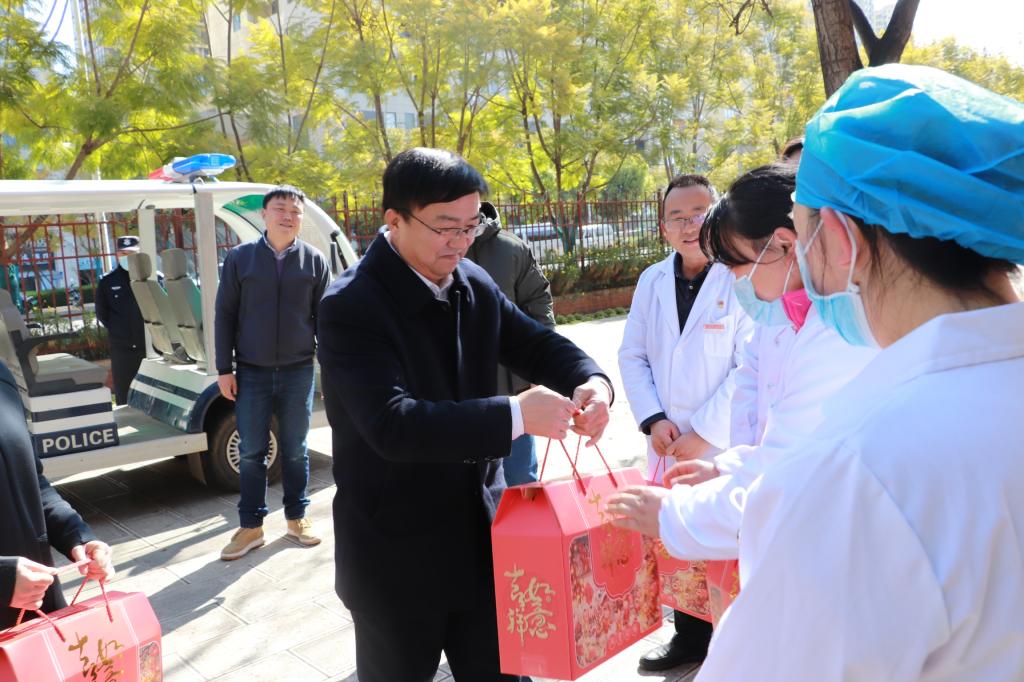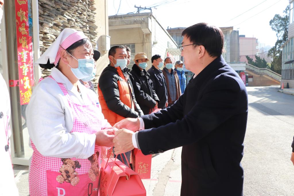 降富楼先后来到附属医院6号楼、保卫处、食堂、后保中心、校医院、学生社区等地,看望慰问在岗职工,向他们致以诚挚的问候和新春祝福,并送上慰问品。