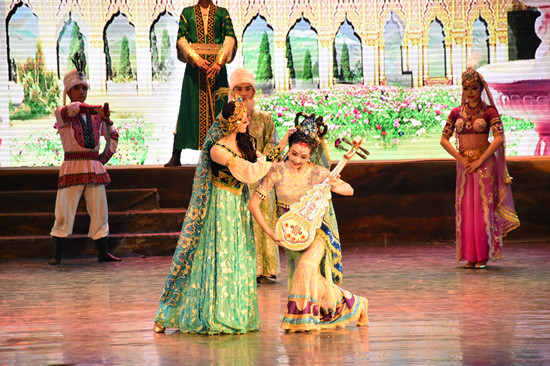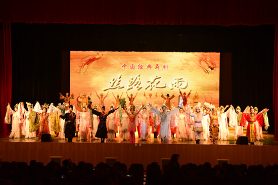 舞剧《丝路花雨》取材于举世闻名的丝绸之路和敦煌莫高窟壁画,是博采各地民间歌舞之长而创作的大型民族舞剧,被誉为“中国民族舞剧的典范”。它以和平、友谊为主题,讲述了敦煌画工神笔张和女儿英娘的悲欢离合,以及他们同波斯商人患难与共、生死相交的故事。舞剧以别具一格的艺术风格将瑰丽多彩的敦煌壁画搬上舞台,彰显了博大精深的敦煌文化,塑造了劳动人民的光辉艺术形象,颂扬了古代丝绸之路上中外人民友谊的源远流长。近两个小时的演出中,变幻的舞台场景、丰富的舞蹈造型、唯美的舞姿令人目不暇接,艺术家们精湛的演技引起了观众的情感共鸣,掌声此起彼伏。舞剧让观众对盛唐丝路文明有了深入的了解,加深了观众们对当前国家实施“一带一路”倡议的理解,极富教育意义。