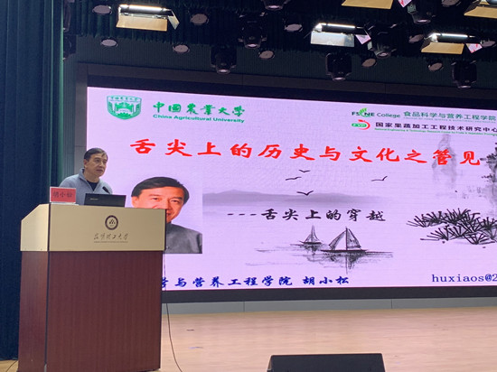 胡小松教授以《舌尖上的历史与文化》为题,从人类的起源说起,按照时间的轨迹,展开人类饮食文化发展的画卷。从史前时期的狩猎采食到种养殖业的产生;从生食到炊器、餐具和烹饪技术的产生;从饮食文化的萌芽到发展、昌盛;从国内到国际,绘制出世界饮食文化差异的演变历程和我们现代食品工业的形成。胡小松教授的报告站位高远、眼界宽阔、信息量大,在专业学术研究精深的同时还极具人文情怀,参与师生纷纷表示从胡小松教授的精彩报告中受益匪浅。