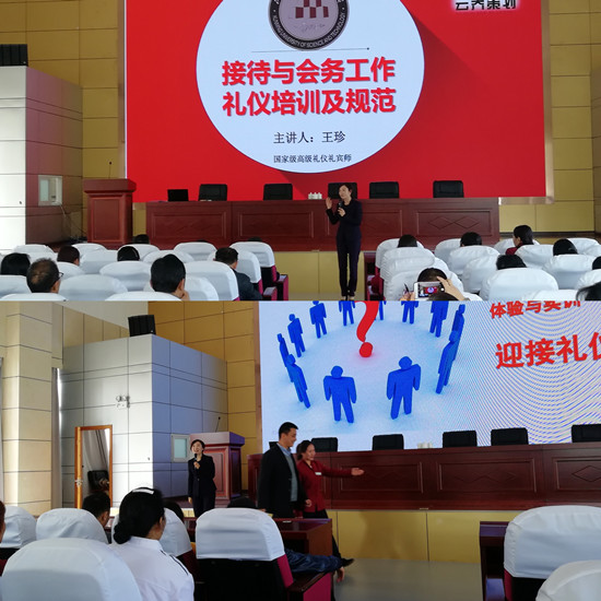 培训主要围绕“接待与会务工作礼仪规范”进行,王老师生动细致地讲述了迎接礼仪、接待礼仪、送客礼仪、会务礼仪及乘车礼仪中需要注意的要素和技巧,赢得了大家的阵阵掌声,极大地提高了职工对培训的兴趣,强化了一线员工的服务礼仪意识。王老师还结合实际,就会务接待礼仪、迎送客礼仪及乘车礼仪邀请一线服务员工上台展开互动,做礼仪示范,以加深大家对培训内容的理解,带动大家的学习积极性。