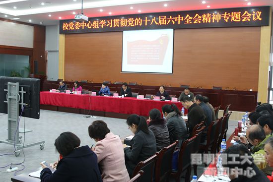 12月1日上午,校党委中心组围绕“学习贯彻党的十八届六中全会精神,抓好党建促发展”主题,在呈贡校区召开集中学习会议。校党政领导张英杰、彭金辉、王华、李莉、陶光荣、周峰越、袁希平出席学习会议。校党委书记张英杰主持会议。